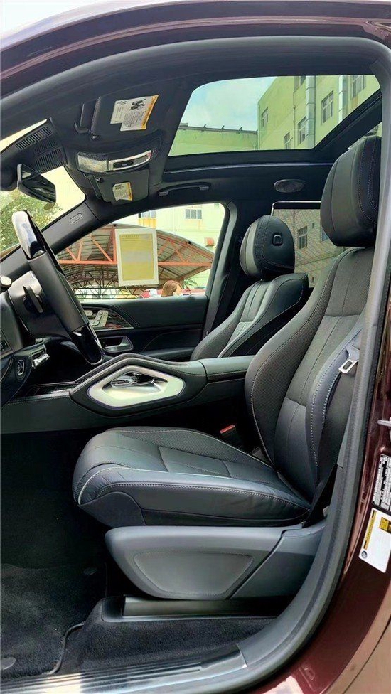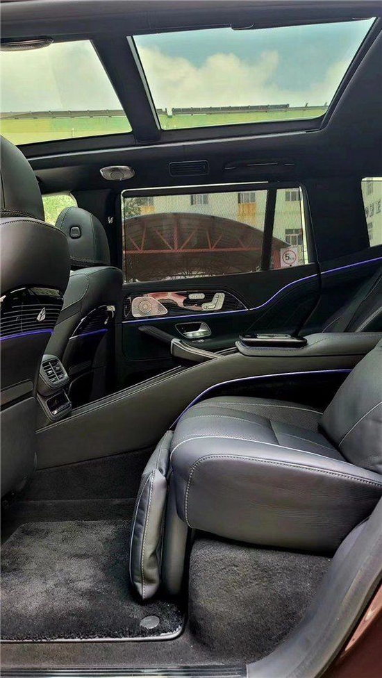 迈巴赫GLS600后排座椅更加靠后,乘坐空间非常舒展,另外后座还配备了巨大腿拖,而中央部分则是由控制台、储物空间和手机无线充电台等进行贯穿,并呈现出了类似于迈巴赫S级相同的头等舱设计。