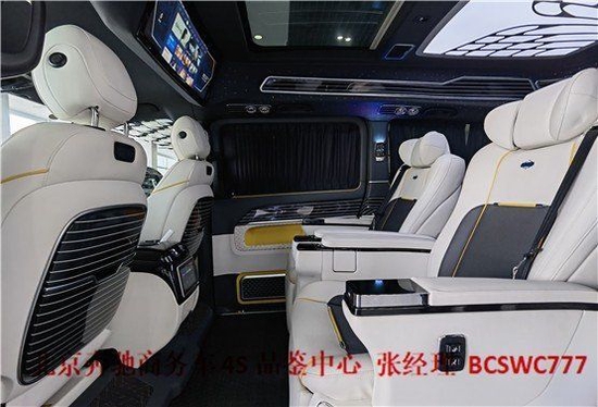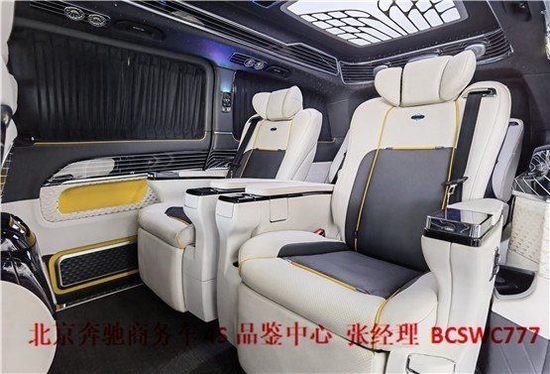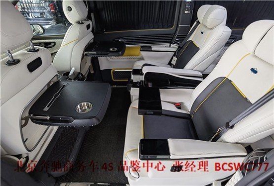 奔驰V260L版以下是贵宾舱二个总裁座椅,这二个座椅具有记忆功能,何为记忆功能呢?就是一键展开及一键收回,这个座椅是根据人体工程学设计而成,能一键式找到您身体最舒适的角度。在总裁座椅双侧有两个隐藏式桌板。总裁座椅中间有个热感电子触摸屏幕可控制后舱设备,屏幕下方有个“语音控制系统”也可控制整个贵宾舱的设备。