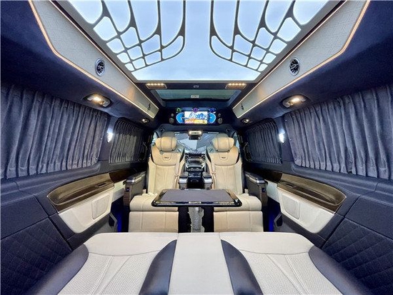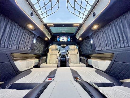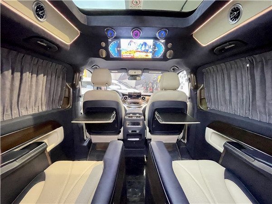 中排座椅转过来后可以形成小型会议室布局,中间有张隐藏式办公桌板瞬间满足会议使用需求,在平时还可以拼成一张简单双人床,这样也可以满足不同人群在旅途中休息需要,这是一款多功能商务房车,车辆上半部分配有进口阿尔坎塔拉皮绒,整体效果更加清新,时尚。