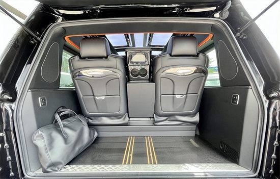 二排两张采用真皮软包的航空头等舱座椅,选用进行加宽,下沉处理的坐垫搭配脚托腰托以及三档的通风、加热、按摩等功能让您享受头等舱级别的乘座感受;并且三档的记忆功能能够让您在乘坐时仅需一键就能调整到最适合您的乘坐姿态。同时整车做了三层的隔音、降噪处理,搭配车内的隐私窗帘设计,让您在出行时有一个静谧、隐私的乘坐空间!