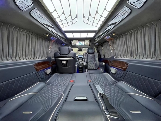 整车做了Bose音响环绕更加有品格,正副驾驶座椅背后两个独立的小桌板搭配全车的隐私窗帘,给你一个完美的私密环境,顶部做了翻毛皮的处理,触感更好,观感更美,全车铺设高光镜面亚克力地板更加凸显奢华。