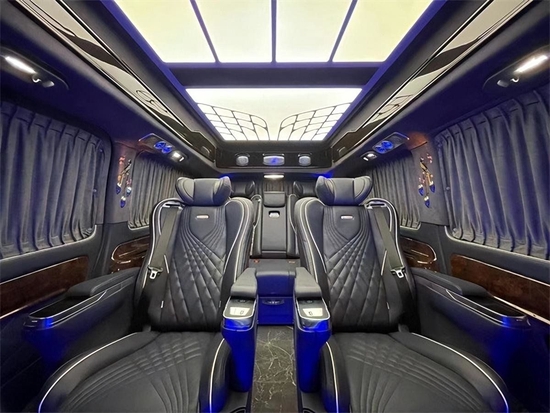 整车做了Bose音响环绕更加有品格,正副驾驶座椅背后两个独立的小桌板搭配全车的隐私窗帘,给你一个完美的私密环境,顶部做了翻毛皮的处理,触感更好,观感更美,全车铺设高光镜面亚克力地板更加凸显奢华。
