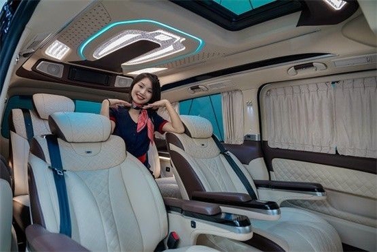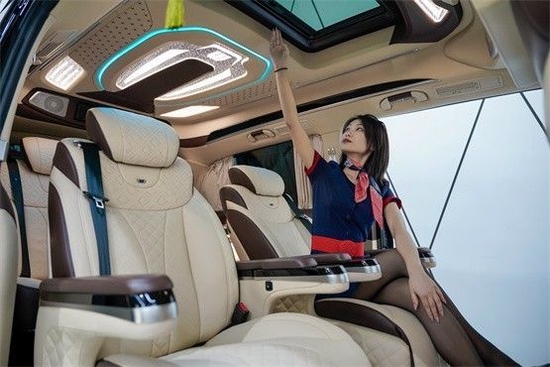 屏幕上方是一个新颖独特的经典航空时钟,下面是一个空气净化器配置,为封闭的内部空间提供新鲜空气,完美地确保内部空气循环。三排座椅是一个非常人性化的座椅,因为后舱空间完全足够,所以可以向后旋转,,前排使用冲孔皮革覆盖豪华皮革座椅,后排舒适;中间单人豪华座椅、触摸屏电控、头枕高度、角腿支撑升降、前后滑动、通风加热、气动按摩、旋转等功能;后座支持平床使用,中间扶手触摸调整座椅前后移动位置,靠背仰卧。