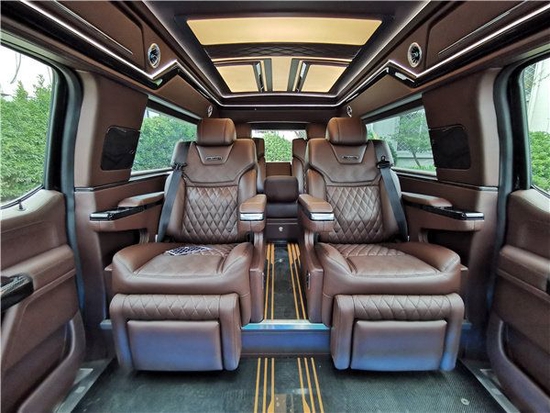 顶部半隔断的车载无线网络电视机,全车10个进口BO音响系统,再配合顶部天窗和后部的三色宫格顶灯相结合,搭配整车的线条式氛围灯,凸显整车的层次感,也烘托了整体的氛围。
