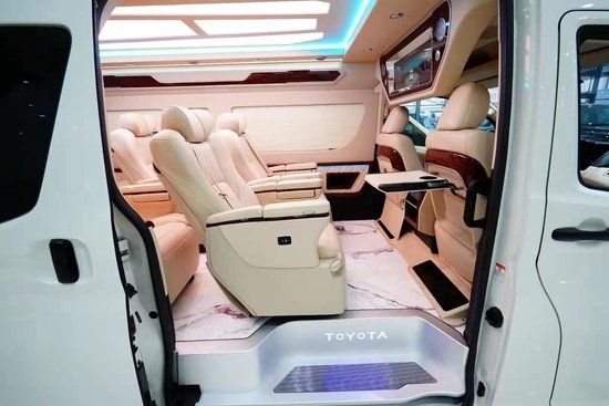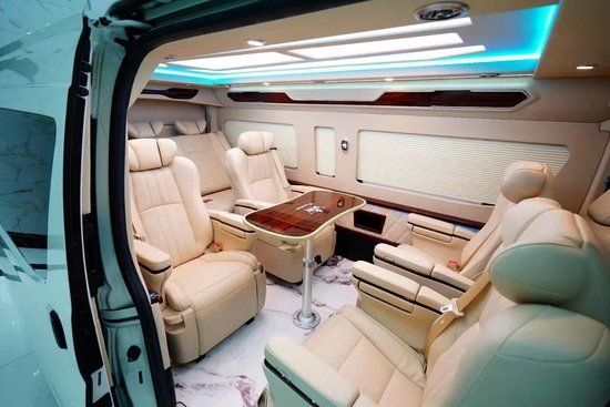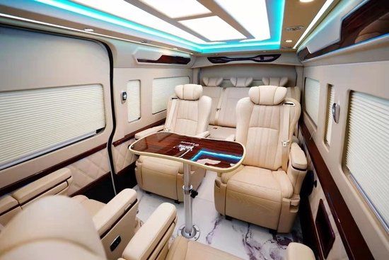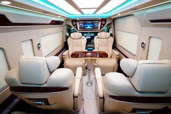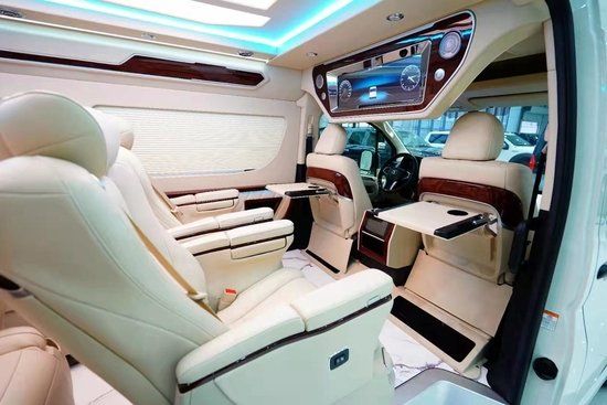 二、三排座椅选用埃尔法样式座椅功能一应俱全:前后调节、靠背角度调节、电动腿托、旋转(二排)、按摩、加热、通风。匹配29寸多媒体宽屏互联网电视、后舱独立5.1声道音响让你感受超级影院航空头等舱的享受。主副驾驶折叠桌方便用餐办公,扶手箱后面触摸控制系统开关后舱灯光及电器。