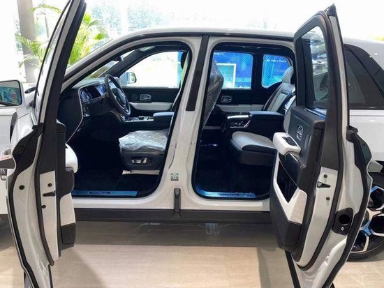 劳斯莱斯库里南BB版车头、侧翼、后进气道处的双R标志变成了黑底银字,前格栅边框、车窗边框、行李厢把手、行李厢下沿饰条、下进风口以及排气管等均变为黑色。格栅中间的竖杆是黑色,但每一根都经过打磨抛光,变得格外动感。