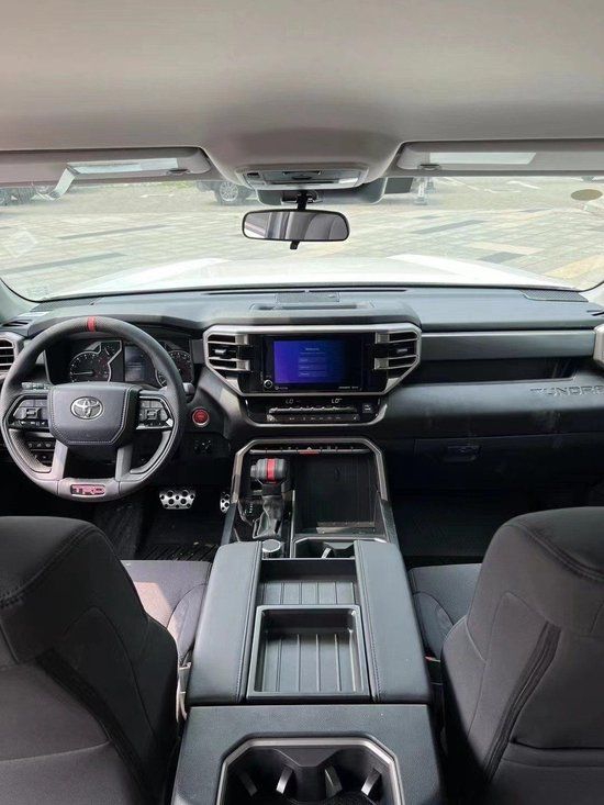 22款丰田坦途的内饰较为简洁大方,在色彩设计上基调较深,处处彰显的科技感和运动感还是暴露了这款车的特点,车间内的储物能力也十分强大,对于这种加版皮卡来说储物空间吝啬说不过去了,如果细数的话,车内光水杯架就有不下与10个,分别在前排扶手箱处、后排扶手处以及车内门板等各处一应俱全。