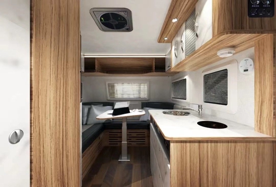 中置的厨房区配备有900W房车专用电磁炉、房车专用85L 双开门车载冰箱、高档不锈钢洗菜盆、房车专用水龙头等等配置,橱柜内包含的储物空间,以及户外配备有抽拉式柴油灶可满足油烟较大的一些烹饪需求。