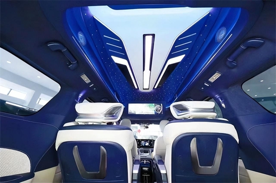 后排沙发床呢支持一键放平,这个舒适度是非常高的,周围进行了真皮的包覆,再加上一些星空顶的点缀,让整个车子看起来非常不错,用于商务接待,或者家庭出行都是个不错的选择。