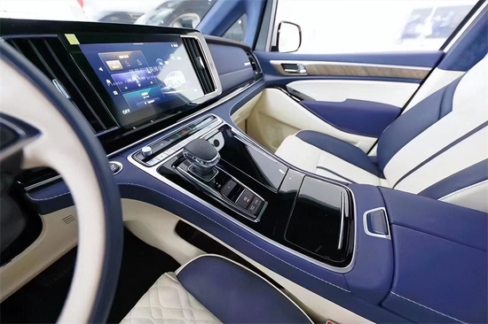 乘客舱的地板部分采用的是游艇级手工铺垫的南美柚木地板,中排的航空头等舱座椅通风加热按摩旋转等功能应有尽有,座椅扶手的一侧折叠升降的触控屏十分炫酷,而另一侧采用了梳妆镜的设计十分贴心。