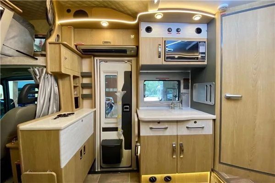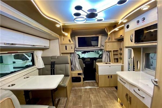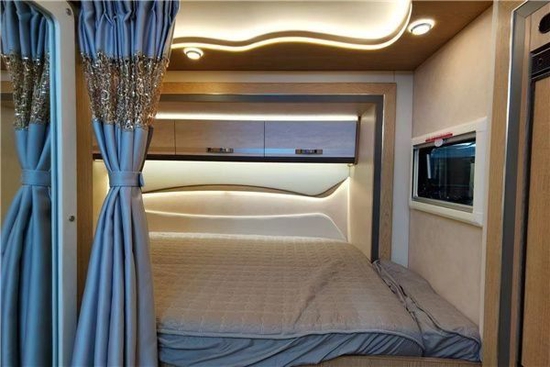房车内部的整体布局是额头床/组合柜、对坐卡座、厨房区、卫生间和尾部睡卧区。车内影音娱乐系统是顶级的:丹拿音响+富生功效+JBL低音炮。额头床部分都有做软包处理,额头床的尺寸达到了2180×1500(mm),对立式车窗+床帘+翻转式32寸高清液晶电视的配置经典,后方的储物立柜能存放零碎的物品。