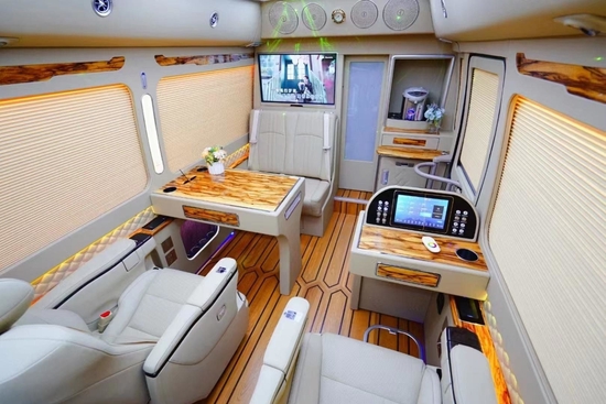 车上定制影院级的影音系统,让你无论是看电影或是K歌都能身临其境。隔断右边配有虎牌电热水壶和车载冰箱,满足你的各种需求。定制的办公桌方便领导在车内办公就餐。