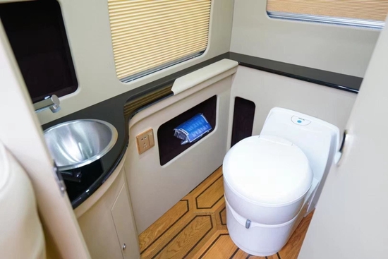 卫生间里标配房车级的冲水马桶,还带有防止异味窜出的阀门,避免给车内带来异味。洗手台的配备也是人性化的考虑,保持你的手部清洁。
