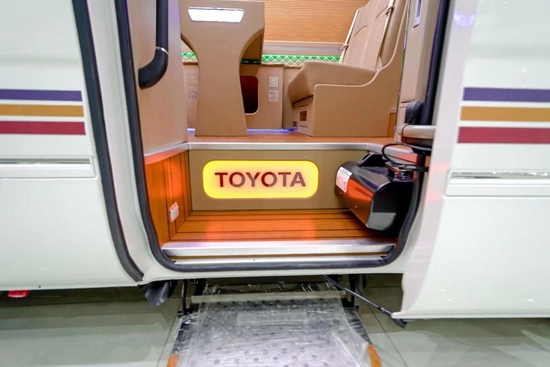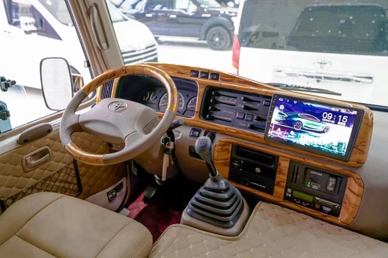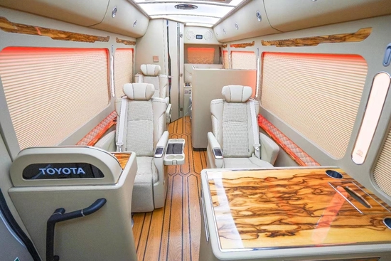 丰田考斯特 (配置|询价)7座车定制版外观采用定制的埃尔法 (配置|询价)蒙娜丽莎版前脸套件、全新设计高亮LED透镜大灯让这款车霸气外露。