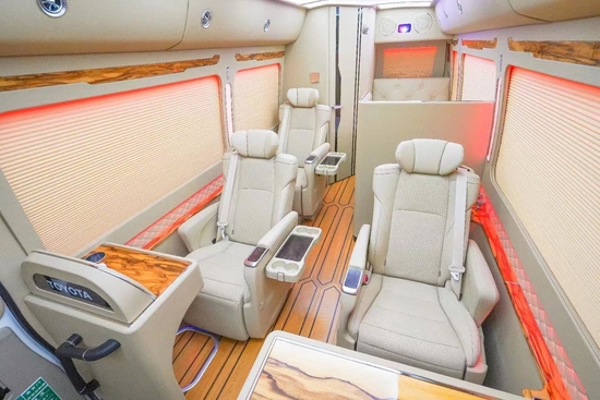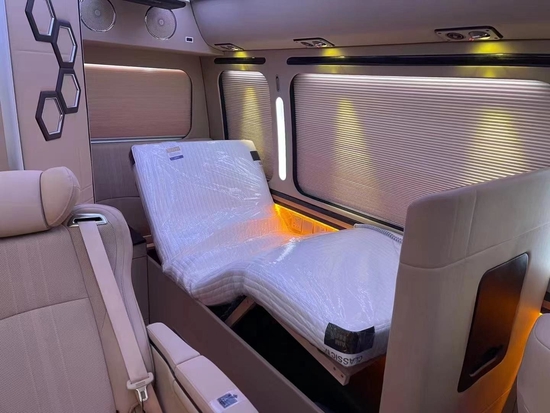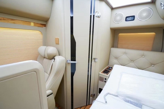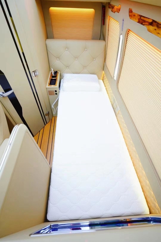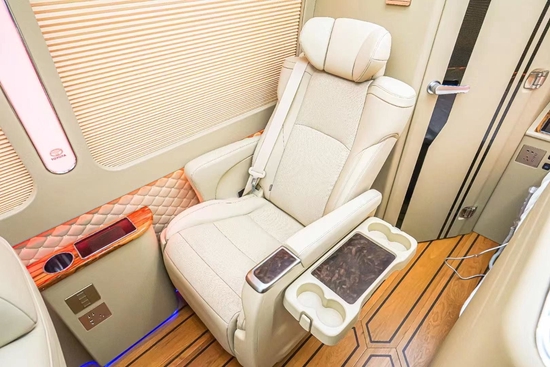 前后舱使用全隔断式的设计,可通过电动隔断门进入到驾驶舱。7米多的车后舱只设立了5张椅子简直不要太宽敞!电动百褶窗帘、模具塑料窗框、模具豪华型装饰、全车隔音装饰、空客A380商务灯光(白色、黄金色、彩色128色调节),这些配置一下把车内的豪华度拉满。