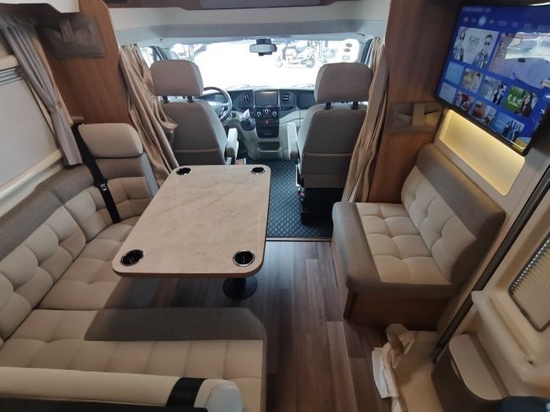 驾驶室后方是全车的会客区,采用的是L型沙发+单人座椅的布局方式,其中L型沙发提供了四条安全带,行车时可以乘坐,加上驾驶室两个座椅整车核载6人,沙发座椅的材质乘坐起来比较亲肤,整体的舒适性也不错。