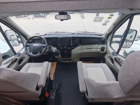 进入驾驶室,整体风格依然是延续了国六依维柯欧胜 (配置|询价)的商用风格,不过这款车在方向盘上加入了桃木装饰和皮质包覆,营造出了商务感,同时主副座椅均为悬浮驾驶座椅,日常乘坐舒适性更好。中控台配备了一台彩色显示大屏和多功能方向盘,方便时操控。