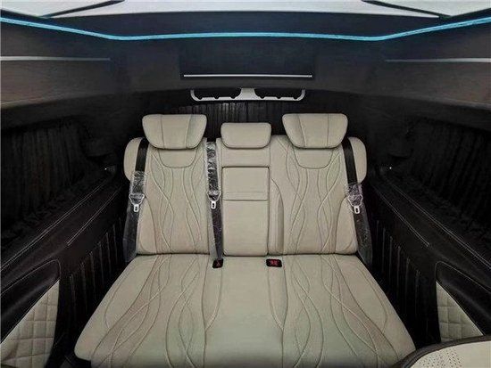 整体款式是迈巴赫V680系列的款式。整体外观是迈巴赫gls (配置|询价)的款式运动风,商务风通通具备。整车尺寸是5370*1920*2080,7座MPV商务车中,这个款式非常的具有优势。外观上还加装了车窗镀铬条,质感,线条感,腰线感都体现得出来。还改装了LED的流水线型大灯和雾灯。以及迈巴赫的经典大饼轮毂。单从外观来看,这款车子都极具特色与造型。