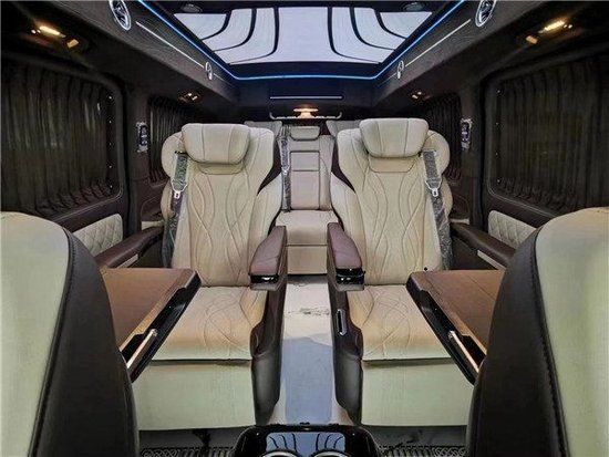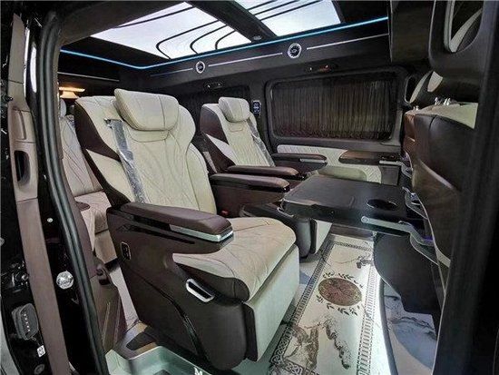 第三排座椅为标准的电动沙发座椅,可以通过隐藏在靠背中部扶手上的控制屏对座椅的靠背、底部的滑轨进行控制调节,必要时可以完全放平,形成一张豪华双人大床。二排座椅与三排座椅中间部分还有便携式的小桌板,二排航空座椅旋转过来与三排形成一个豪华、私密的商务区。奔驰威霆高顶7座商务车22新款优惠来袭