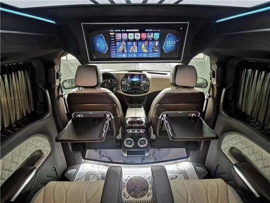驾驶舱后面的座椅还配有一个折叠的小桌板,可供日常的办公放一些物品。商务舱的话也是非常的宽大和豪华。首先顶部半隔断的电视机可以连接车载WiFi或者无线手机热点,正常的看电视听音乐都可以。奔驰威霆高顶7座商务车22新款优惠来袭