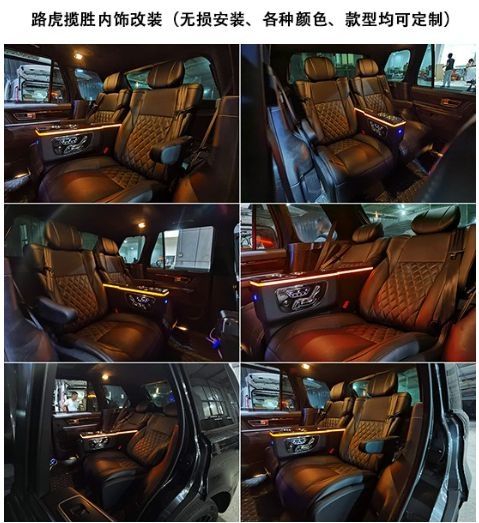 越野车系列SUV改装项目清单(包括但不限于):航空座椅、柚木地板、全隔断、带升降电视、半隔断吧台、桃木方向盘、方向真皮包、覆仪表台真皮包覆、驾驶座真皮包覆、驾驶座电动调节、驾驶座电动加热、驾驶座电动通风、驾驶座电动按摩、驾驶座气动按摩、驾驶座加棉、驾驶舱鹿皮顶、后舱鹿皮顶、后舱星空顶、九宫格顶灯、ABCD柱鹿皮包覆、遮阳板鹿皮包覆、驾驶位门板真皮包覆、中门门板真皮包覆、后尾门门板真皮包覆、全车侧壁真皮包覆、全车私密手动窗帘、主副驾驶中央扶手箱、主副驾驶扶手带冰箱、吸顶电视、主副驾驶靠背小桌板、可拆卸小桌板车、车内氛围灯、等其他项目。