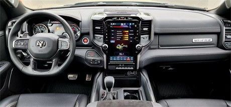 22款道奇霸王龙内饰部分进一步强化了其高性能版本的形象,中控台和座椅随处可见的TRX标识便是最好的例证。)同时,作为道奇家族的旗舰车型,新车还配备了12英寸竖置中控屏幕,除了支持蓝牙、导航和车载Wi-Fi等常见功能,还支持Apple CarPlay和Android Auto手机映射。