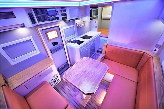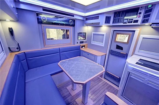 会客区真皮软包唤醒沙发布局,满足多人乘坐,卡座沙发搭配气动升降餐桌可变为一张沙发床;固定式安全带保护行车途中乘客的人身安全。坐垫厚实,弧形靠背也提供一定的支持感,整体来说乘坐舒适感还是不错的;沙发内侧墙壁2个独立外推窗,提供采光及通风换气效果;三菱重工变频空调(单冷)制冷效果快,可手动调节温度;吊柜方便日常收纳物品。