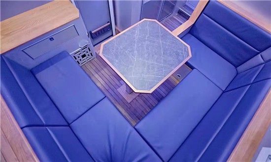 车内实木(美国红橡)搭配拉丝铝板家具+环保型房车专用柚木地板革;布局方面,采用了会客区U型沙发+气动升降餐桌+实木组合式橱柜+卫生间+车尾横置床的布局结构设计,全车的储物空间非常丰富,对于长期户外旅游者来说实用性高。暖色系氛围更贴居家效果,让成员即使在外旅行也能感受到住家的感觉。会客区真皮软包U型沙发满足4人乘坐,U型沙发搭配气动升降餐桌可变为一张沙发床;坐垫厚实,弧形靠背也提供一定的支持感,整体来说乘坐舒适感还是不错的;沙发内侧墙壁2个独立外推窗,提供采光及通风换气效果;三菱重工变频空调(单冷)制冷效果快,可手动调节温度;吊柜方便日常收纳物品。