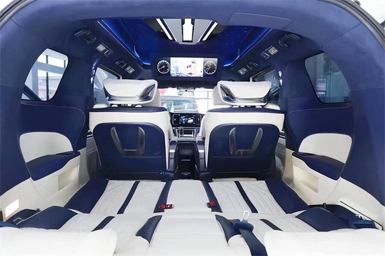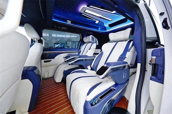 后排沙发床呢支持一键放平,这个舒适度是非常高的,周围进行了真皮的包覆,再加上一些星空顶的点缀,让整个车子看起来非常不错,用于商务接待,或者家庭出行都是个不错的选择。