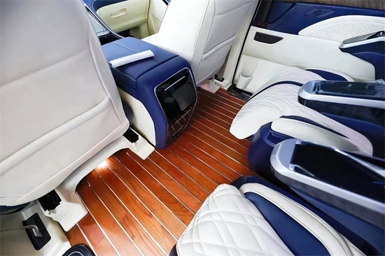乘客舱的地板部分采用的是游艇级手工铺垫的南美柚木地板,中排的航空头等舱座椅通风加热按摩旋转等功能应有尽有,座椅扶手的一侧折叠升降的触控屏十分炫酷,而另一侧采用了梳妆镜的设计十分贴心。