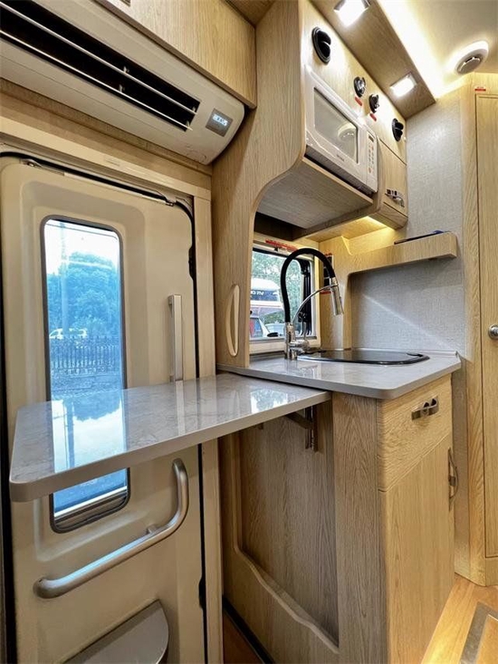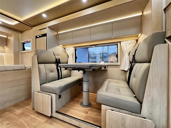 车内部分采用中式的家居风格更具温馨感;会客区双人对坐卡座设计可向外侧拓展开来增加车内生活空间,将餐桌向下可与卡座拼接为一张1900*945(mm)的沙发床。上方设有吊柜,可以放置一些物品,配合我们尾部储物仓让我们整车的储物空间达到惊人的2500L。