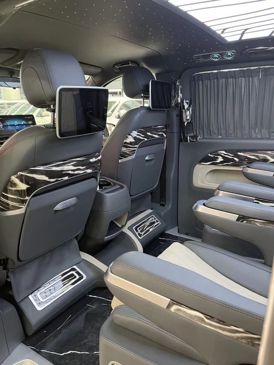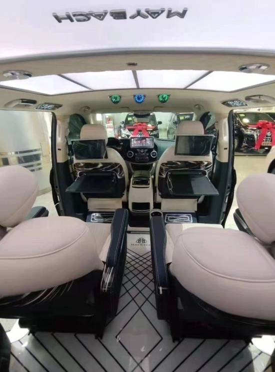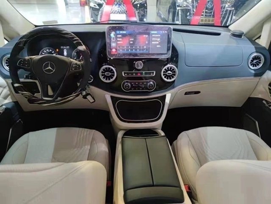 驾驶室整体换装也是比较大的,升级了奔驰V级 的悬浮式中控,迈巴赫涡轮出风口,具有非常高的豪华感,这款车主副驾驶座椅升级多项电动调节与加热功能,可任意调控的温度的车载冰箱,真皮包覆的中控台与奔驰钟表,彰显了这款奔驰威霆的独特设计与尊贵感。