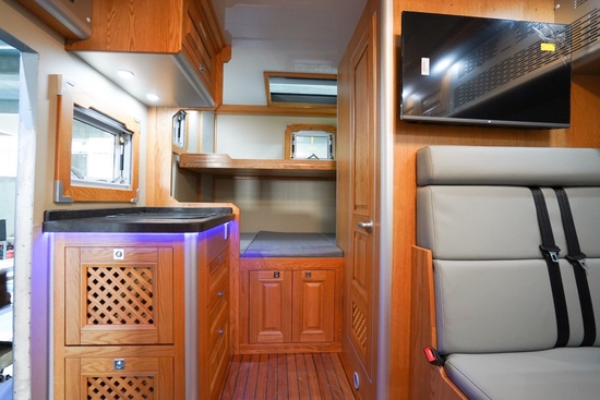 内饰方面均为实木板材,可以选择柚木、橡木、胡桃木、桃花心木等几种风格,相较于这台车的霸气外观,其内部木制色调看起来更加温馨和谐与外观形成了一定的反差,既能硬核越野也能舒适生活。水电方面这款车标配400L保温清水箱,75L灰水箱;1600AH磷酸铁锂电池,3000W+3000W逆变器,900W太阳能板和4000W发电机,这样的配置足够你出门远行水电无忧。