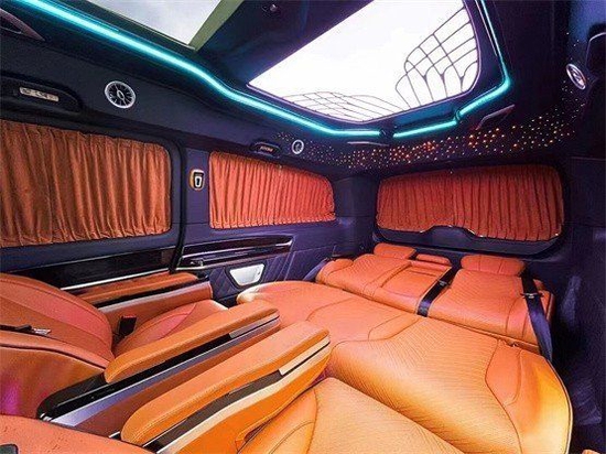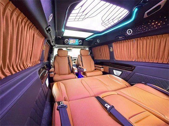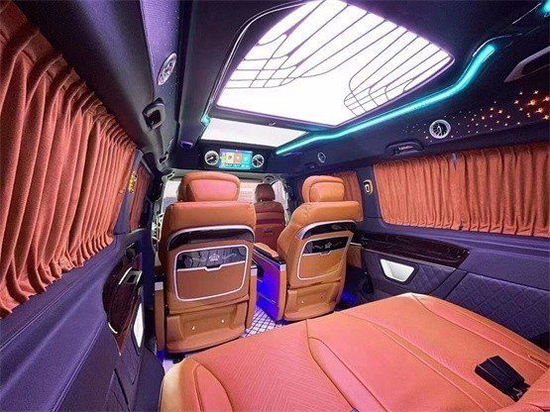 奔驰改装商务车v260L内饰非常奢华,无论是中控台还是方向盘,都与奔驰轿车采取了相同的规划,进入车内,绝对能让你情不自禁的感叹道:这才是大奔!环顾座椅四周,真皮、实木、金属合理搭配,整体视觉效果相当不错,做工方面,V级车内饰自然也坚持了豪华品牌应有的高水准。奔驰V级采用的三幅式方向盘是与C级同款样式,所以,不会给驾驶者带来开大车的压力。换挡拨片的加入,也算是一处惊喜。22款奔驰V级V260L商务车的驾驶室展现出奢华成熟,全新三幅式方向盘、奔驰V级搭载M274的2.0T高功率版涡轮增压发动机(211马力、350N·m),在1200rpm时即可输出峰值扭矩,能最大化降低涡轮迟滞,综合油耗仅为8.5L/100km。其所搭配的7G-TRONIC PLUS变速箱也是足够经典,经过重新设计过的油道以及齿比设计来适应新V房车的日常需求,稳定性和平顺性是最大特点。