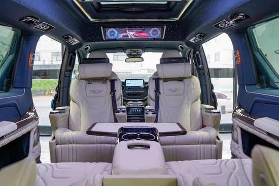 全新平行进口版奔驰V250商务车内饰方面同样做了整体的升级,中控台、方向盘、门板、车侧壁、车顶、进门的踏步整体升级包覆。正副驾驶座椅升级包覆、正副驾驶座椅中间加装车载扶手冰箱、正副驾驶座椅头顶定制宽屏车载网络电视、正副驾驶座椅椅背后方加装可伸缩的小桌板。第二排座椅升级成两个独立的航空座椅,航空座椅带多向电动调节功能,带通风、加热、按摩等舒适功能、同时航空座椅还带有选装功能,旋转之后可与第三排座椅形成对坐状态。第三排座椅升级成宽大舒适的三联排沙发床,可电动调节、前后移动,靠背可180度放平平卧。