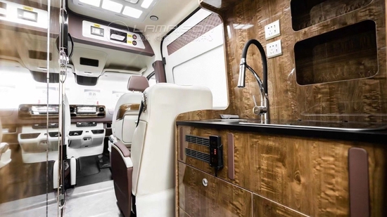 而这一款奔驰商务车更是配备了高级电动小桌板,并内嵌有搭配键盘的苹果平板电脑,使得大家出行的更加智能便捷,尤其是对于商务洽谈的时候。而车上的一般配置都是集中在吧台的位置,高级的材料体现这他的价值,42寸的超大高清车载可升降电视,搭配了影院级的环绕式殿堂级音响系统。