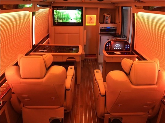 丰田考斯特改装商务车舒适的座椅再配备上高档的办公桌,办公桌加桃木和真皮的装饰,丰田考斯特改装商务车充分满足了商务办公的需要,更加能够提高丰田考斯特改装商务车的档次感,丰田考斯特全新配备高档意大利真皮航空座椅,并配置了电动脚托、电动靠背。让乘客享受头等舱般的享受。航空座椅前配备了真皮办公桌,桌面配以多媒体数据转换接盒,实现多功能的移动办公与会议展示,出于环保考虑上丰田考斯特停止了柴油版的生产,对于车子的舒适度和档次感的追求上进行了更大调整。