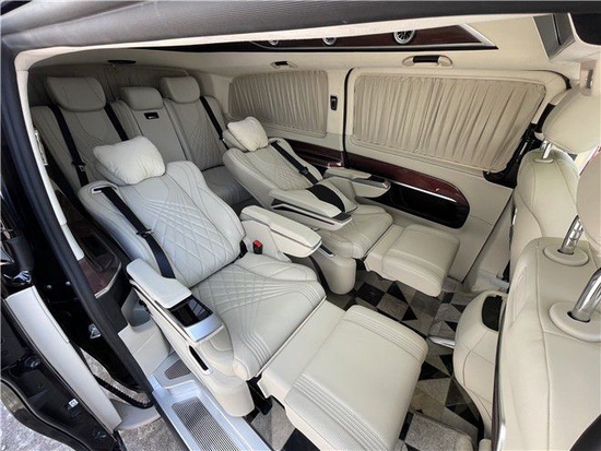 奔驰V260 (配置|询价)高顶双色七座商务车,乘客舱前排首长级多功能按摩座椅带脚托,设计了滑轨,可自由电动移动和收缩,适应多种身高、体型的乘客,多种坐姿任君挑选,将舒适惬意延伸到车内每个角落。座椅旋转对坐,小牛 (配置|询价)皮地板上配置有可拆卸小方桌,时尚钢琴烤漆,高承重性,任意开启商务洽谈模式。