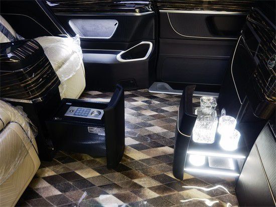奔驰V260L改装4+2隔断版行政总裁,进入后舱立刻就会被它的豪华绚丽而征服,驾驶舱与后舱是分隔设计,形成两个独立的空间。隔断吧台采用42寸超大液晶升降电视,带投屏功能。奔驰V260L改装4+2隔断版行政总裁,吧台与座椅完美结合,下方是隐藏式酒柜,合理利用了车内空间,使您接待贵宾不失格调。奔驰V260L改装4+2隔断版行政总裁内饰,地板采用手工拼接马毛地毯,大气高贵。整体内饰设计是由意大利知名设计师亲自指导,内饰格调以年轻时尚优雅为主题,大量植入了碳钎维饰件元素,令整个内饰感官与众不同,散发出自信内敛独具一格的气质。引人注目,又极具奢华感。色彩对比沉稳醒目,定制版迈巴赫星空顶灯,体现精湛技艺和艺术造诣的完美呈现。可以说是目前国内前所未有的超级豪华商务车型。