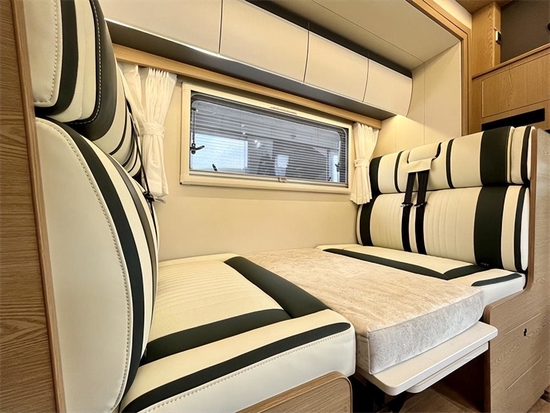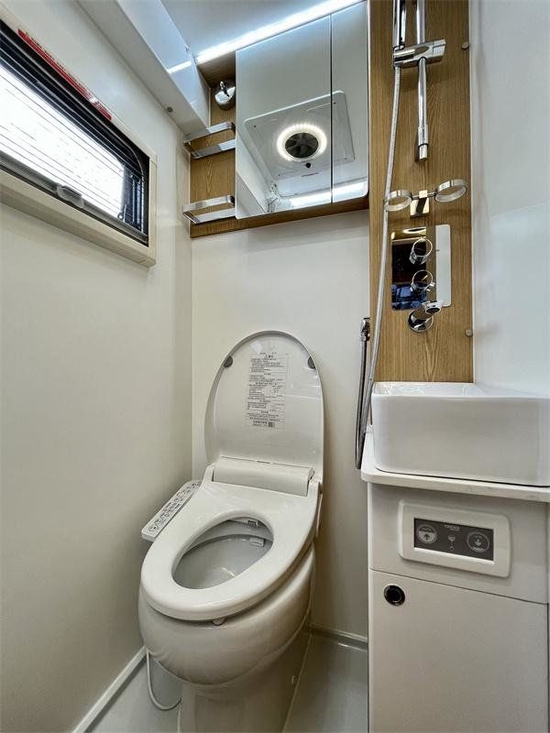 侧拓展区域对应车内的4人会客区,卡座沙发采用nappa皮包覆,座椅的横向长度为900mm,两卡座间距为730mm,可以满足四人同时落座的脚部活动空间。餐桌为机械折叠形式,必要时可转换为一张1870×945(mm)床铺。餐桌也带有向外延展功能。 卡座后方是一款标配的赛特福德141.5升立式压缩机冰箱,冷冻冷藏单独设计,非常适合配置在国内的房车上。