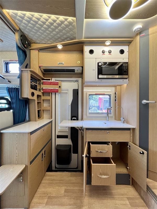 中门顶部配备三菱重工1.5P变频空调,带有数字显示功能。空调在这款车起到非常重要的作用,可以利用室外机的散发的热量给水箱保温,实现地暖的效果。同时依靠车内的多个预留风道,可实现车内车外的气压平衡,对舒适度的提升比较明显。全新E途pro max厨房区比较紧凑,厨台上配备了洗菜池,标配的是移动电磁炉,只在需要时使用,不作为固定嵌入式设计。车内车外共用双向抽屉,右侧还有部分储物空间。厨房顶部依然是行车空调的出风口,同时还配备了微波炉等厨房设备。