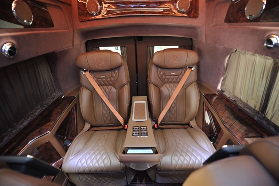 GMC商务之星整车内饰采用半隔断设计,带有一体式观景隔热私密玻璃。第二排湾流经典型豪华航空椅电动通风/加热/气压按摩/旋转/前后/腿托/靠背,第二排座椅后背带有折叠办公桌及个人多媒体影音系统,第三排左右独立电动沙发椅带电动通风/加热/气压按摩。