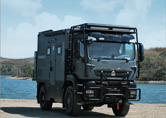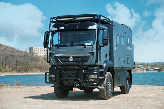 这款房车基于豪沃TX4x4越野底盘打造,提供了双驱和四驱两个版本,以应对不同消费群体的需求,核载6人,C本驾驶、上蓝牌。前桥与后桥都带差速锁、分动器还带有轴间差速锁,这样的三把差速锁的设计,极大提高车辆的脱困能力。发动机采用MC11.40-61 10.5T直列六缸柴油发动机,匹配双特6AT自动变速箱。额定载客6人。最高设计时速142km/h(选装双速分动器在低速区时最高车速93),工况时速70-100km/h