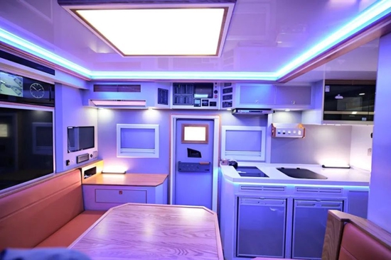 生活舱的内饰豪华不失温馨;前部会客区设有环形大卡座,进口超纤软包,可供宾客舒适乘坐,搭配房车专用双电动支腿升降餐桌还能拼成一张大床;两侧设有多个双层铸铝外推窗(带纱窗、遮阳帘);顶部左侧搭载多组储物吊柜,右侧设有三菱重工变频空调(单冷,行、驻车双用)。