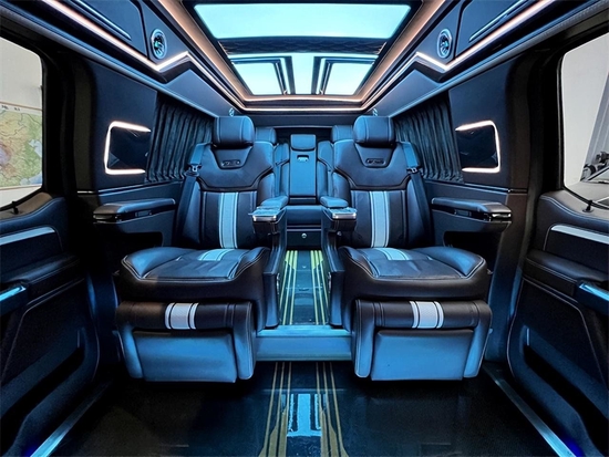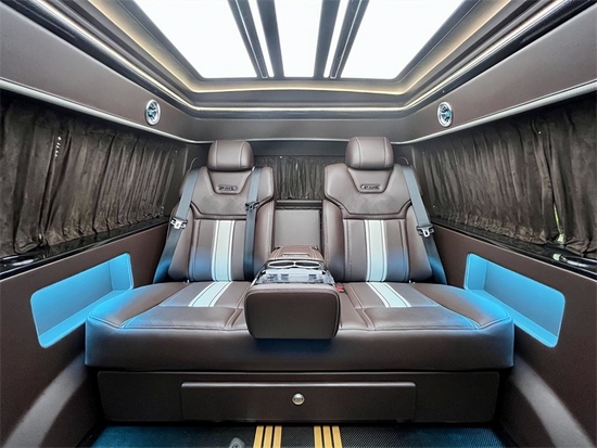 整车强化了隔音降噪,静音效果很好,中间两排的航空座椅功能性十分强大,通风,按摩,加热,腿托都具备。多项的电子调节,光按摩就有三种模式。 第三排是联动的沙发床,他可以分区域控制,能够满足多人乘坐时应对座椅的多种需求。靠背俯仰,前后滑动可变床,有集成式的屏幕来控制。长途的旅行中也需要一个商务性功能强大的座椅来休息,这款车子能满足,也能实现。