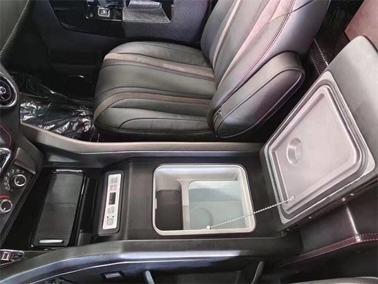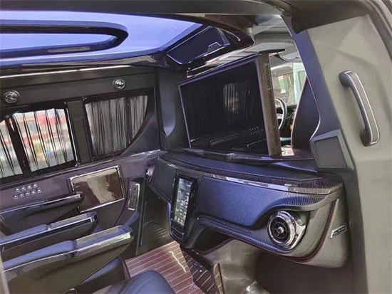 此外车内还配备有电动的折叠办公桌,椅背折叠办公桌,出行的过程中需要工作,也可以随时随地的进入到工作状态。这是一款半隔断带吧台的一个设计有上下可以升降的电视机,日常的看电影,听音乐以及会议,他都可以办得到。下面的吧台触摸屏的调节用的也是碳纤维的装饰,满满的奢华运动风在这款车上体现的淋漓尽致。