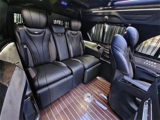 它是一款7座的商务车,整个内饰做的也是极尽的奢华。真皮碳纤维镶嵌的豪华方向盘,整个驾驶舱和商务舱都做了豪华的包覆。后面两排的时尚的豪华航空座椅,带有按摩通风加热电动腿托旋转等多项功能。算是一个豪华型的老板座驾头等舱。第3排左右也是一个独立的电动沙发椅,各项功能也全部都配置上。车子的后舱呢,也有多功能触摸屏控制系统,而且有车载多媒体共享系统,并带有外置的USB接口。