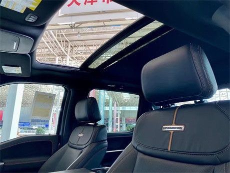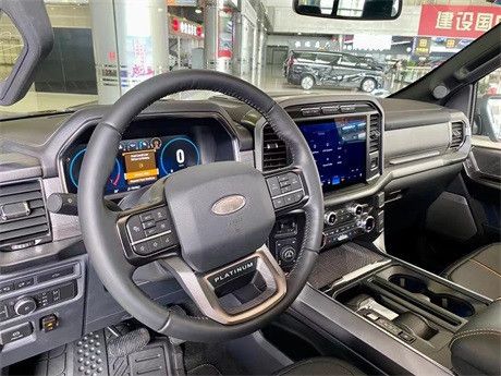 福特F150内饰采用独特的中控台和门饰板面漆和真皮包裹的方向盘,中控台部分辅以银色饰板装饰,六指针仪表盘的设计有些后工业时代的复古风格,采用带电冷热功能的可记忆式皮革座椅,头枕四向可调,搭配铝饰条和黑色钢琴烤漆内饰。