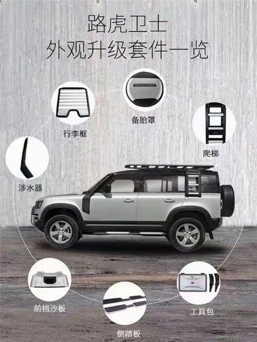 2021款路虎卫士部分设计上延续了老款产品上的硬派复古特征,比如平直刚毅的腰线、窗线等主要特征线在新车型上均得以保留,中网、大灯、尾灯等外观细节上采用了圆角矩形的处理,同时突出的轮眉也彰显该车的越野特性。除此之外,新卫士也融入了更多时尚的设计风格。