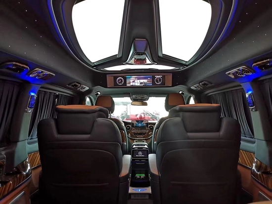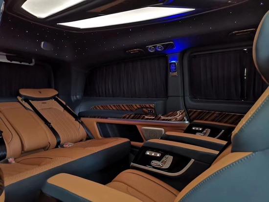 2022款奔驰V260L改装商务车第二排航空座椅为带电动、加热、按摩、通风功能的航空级首长席,可沿着地面上滑轨实现一键电动式前后滑动,对于这种智能化的乘坐体验,是原厂车型笨拙的手动拖拽模式所望尘莫及的。车内的氛围灯打开后,奔驰V260内舱变得灵活多变,气氛也可以根据主灯颜色变换而变化,主要的乘坐座椅配置的独立的按摩功能,通风加热,一体腿托,功能丰富,乘坐舒适,是商务接待用车的代步良品
